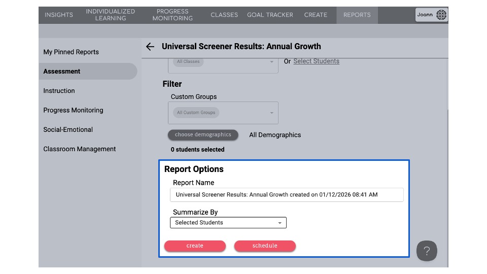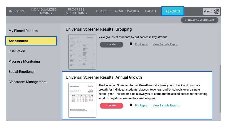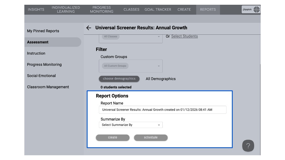 Navigate to the reports tab, select assessment and locate the Universal Screener Results: Annual Growth report. Click create.