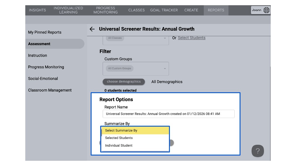 Select the group of students to be included in this report. Read more about creating groups on reports here.