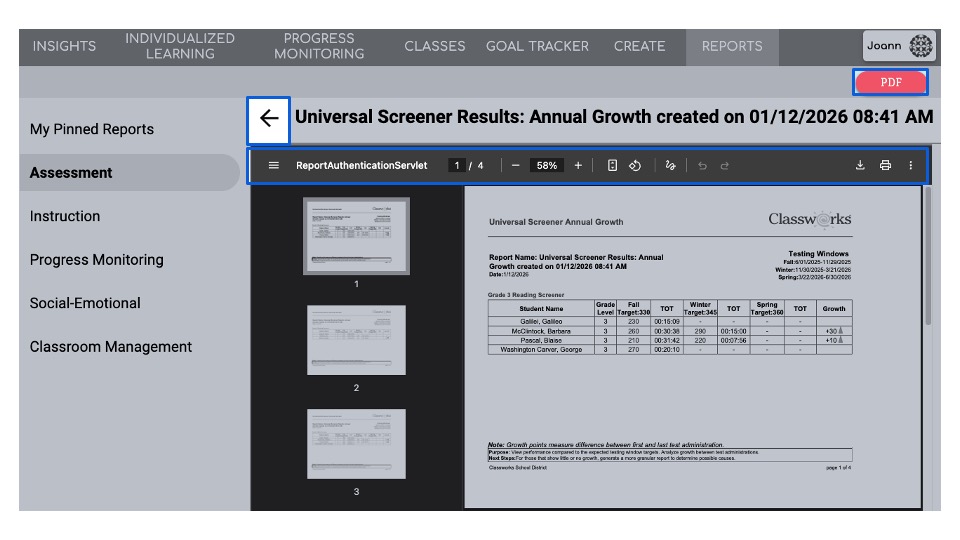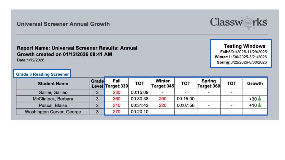 The Universal Screener Annual Growth report allows you to track and compare growth for individual students, classes, teachers, and/or schools over a single school year. This report also allows you to compare the scaled scores to the testing window targets to ensure they are being met.