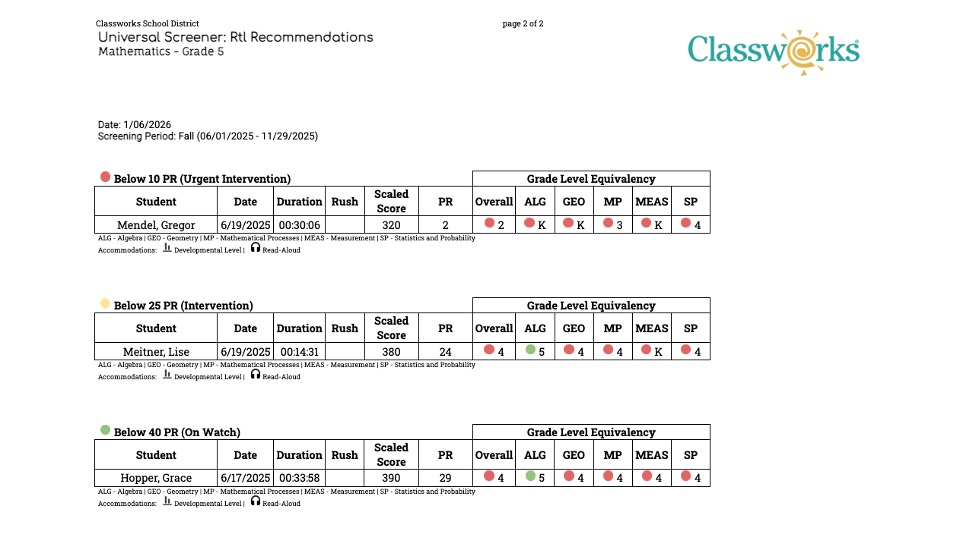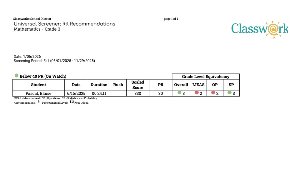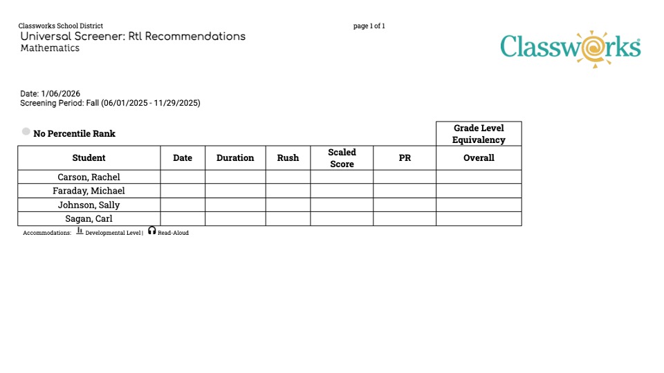 Accommodations Utilized: The icons displayed below the table will also be included next to the student's name if they were utilized during the screener administration.