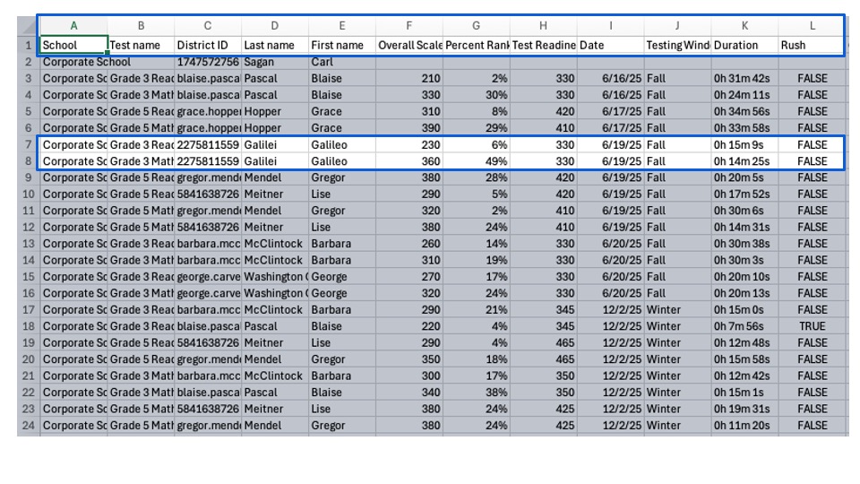 You can export the results of a Universal Screener test administration to a CSV or tab-delimited data file. The data file can be opened in a spreadsheet to manipulate the data as needed. For example, you may wish to sort the data to find your bottom 25% or top 25% of students.