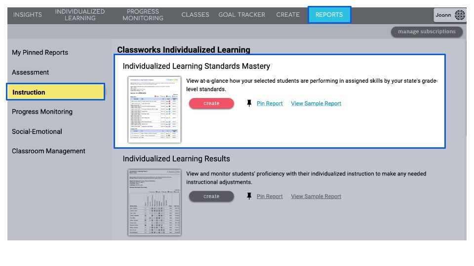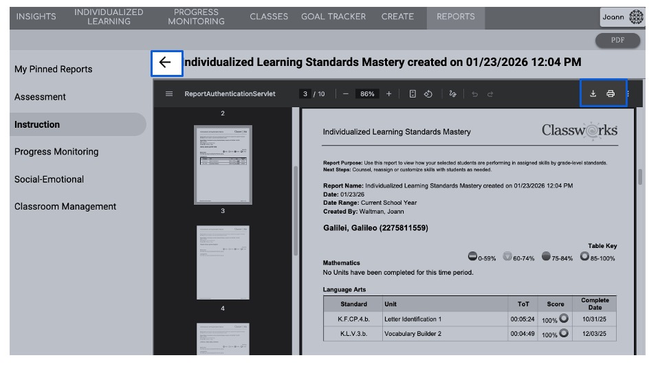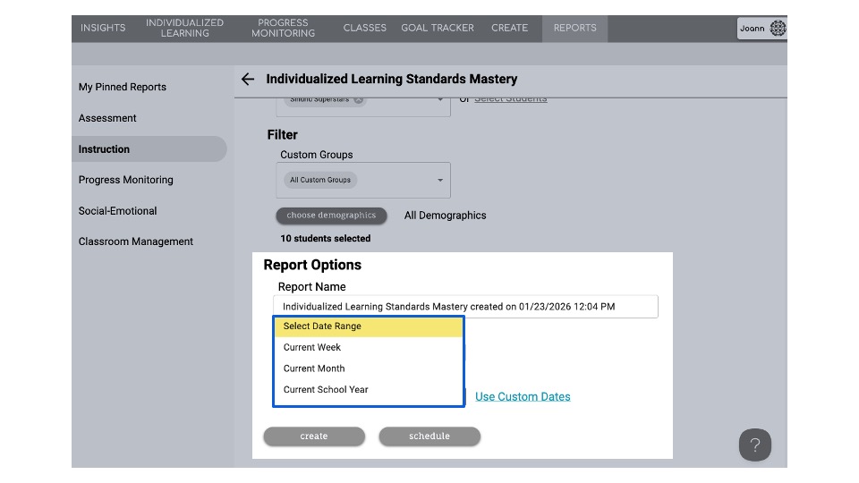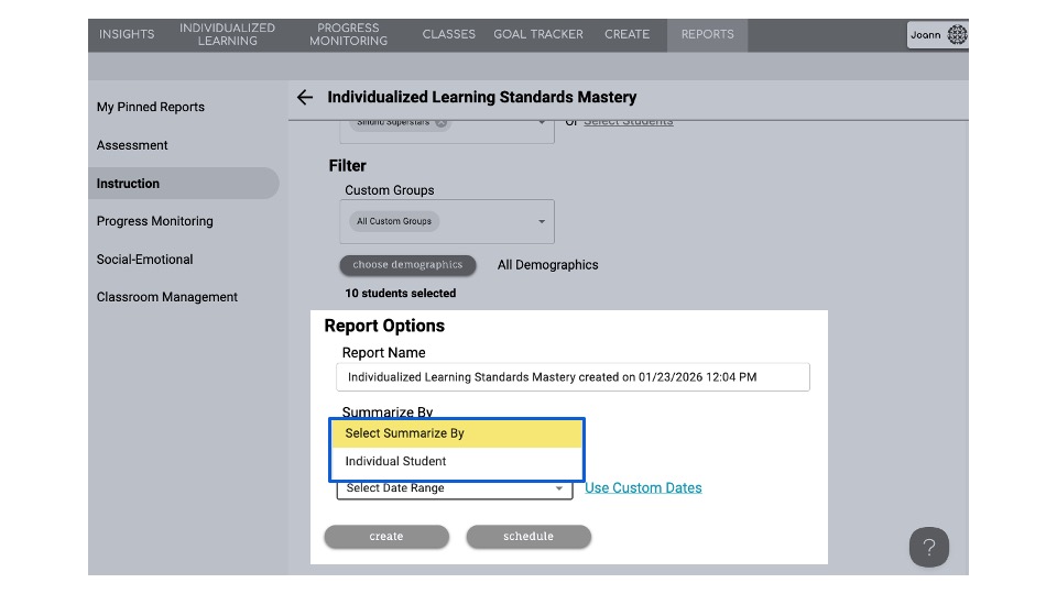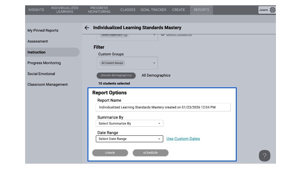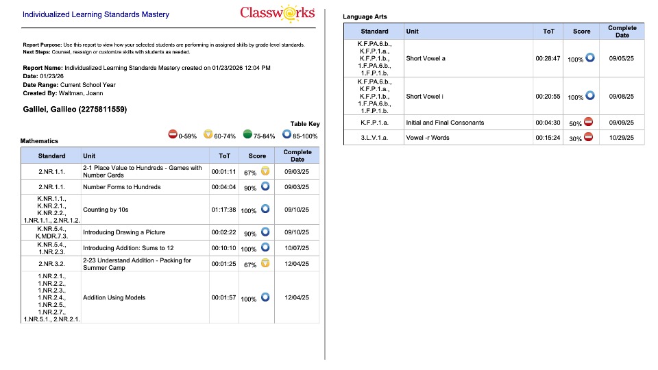 Individualized Learning Standards Mastery Report