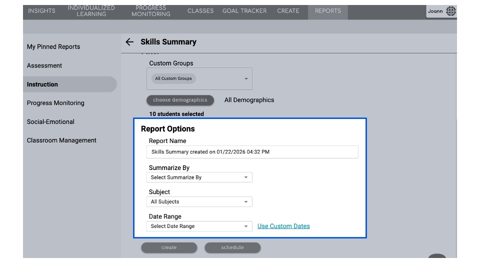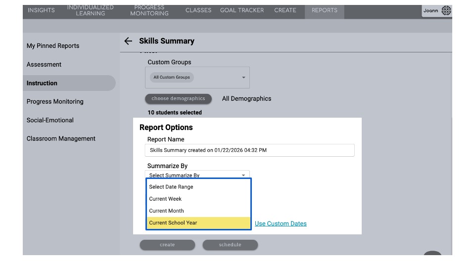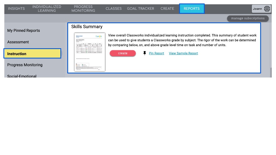 Navigate to the Reports tab, click Instruction, and scroll to locate Skills Summary.