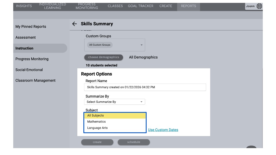 - Select subjects to include: All, Mathematics, Language Arts