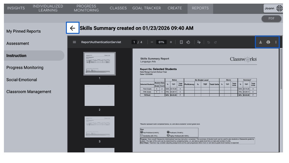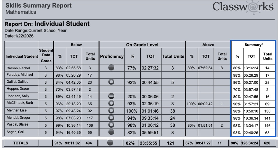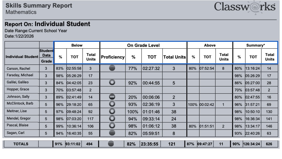 The Classworks Skill Summary Report provides a quick, high-level view of how students are performing within their Individualized Learning Paths (ILPs). The report summarizes completed individualized learning instruction and allows educators to see overall performance by subject.
