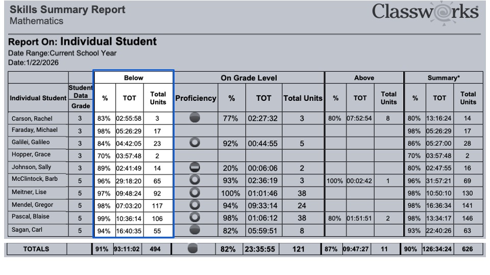 In the sample report below, each student has completed work that is below their enrolled grade level.