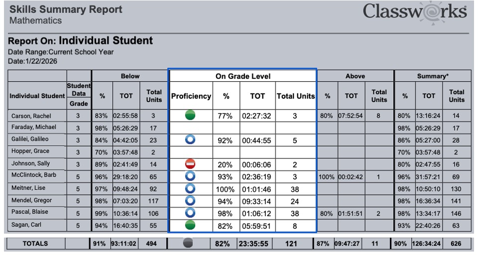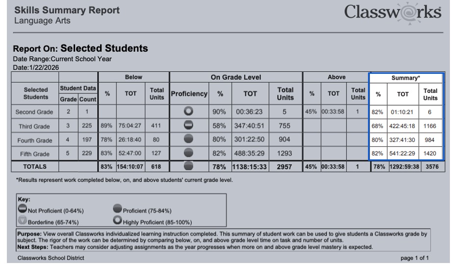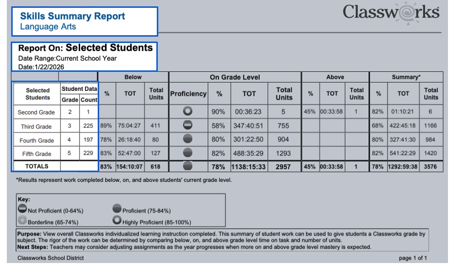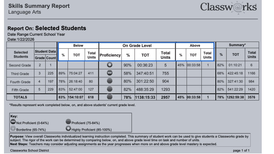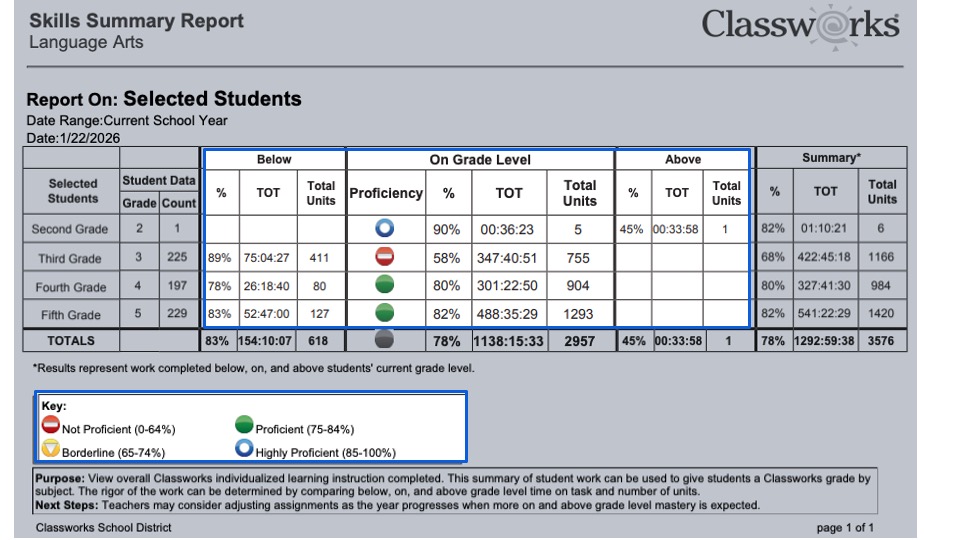 This report also highlights how student performance differs when working on below-grade–level, on-grade–level, and above-grade–level units. By comparing time on task and the number of units completed at each level, educators can better understand the rigor of the work students are engaging in and how their instructional level aligns with grade-level expectations. This information may also be used to support assigning a Classworks grade by subject, when appropriate.