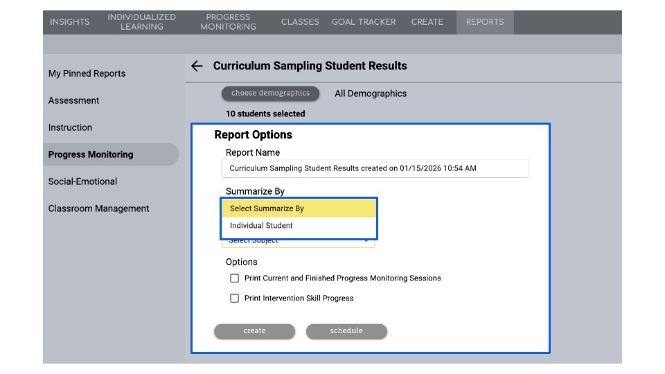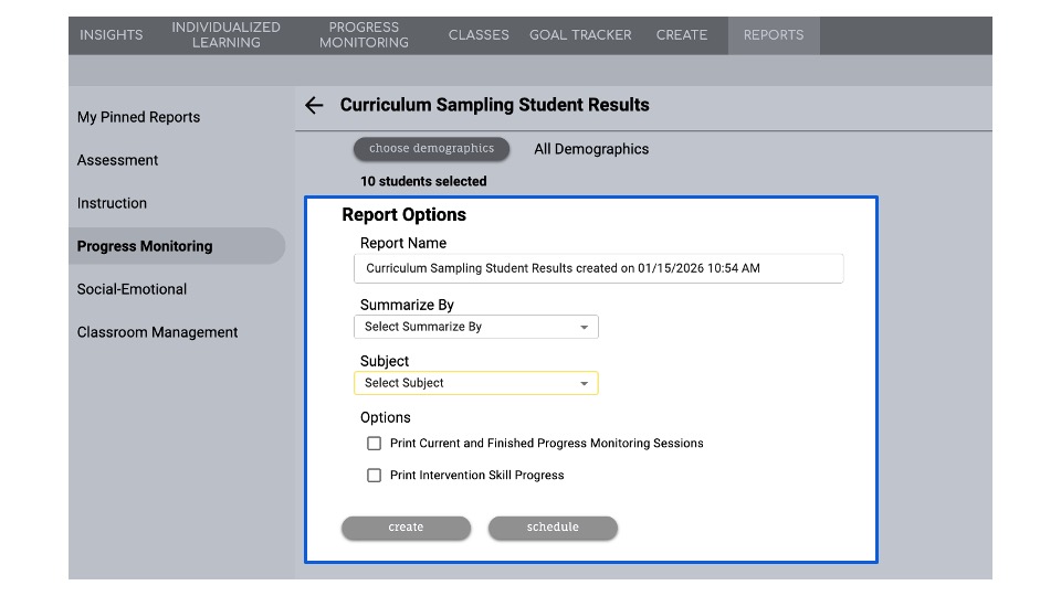 - Print Current and Finished Progress Monitoring Sessions: Will include all sessions the student has completed during the academic year. This option is frequently used when running this report at the end of the school year to capture all the gains made by each student during the year.