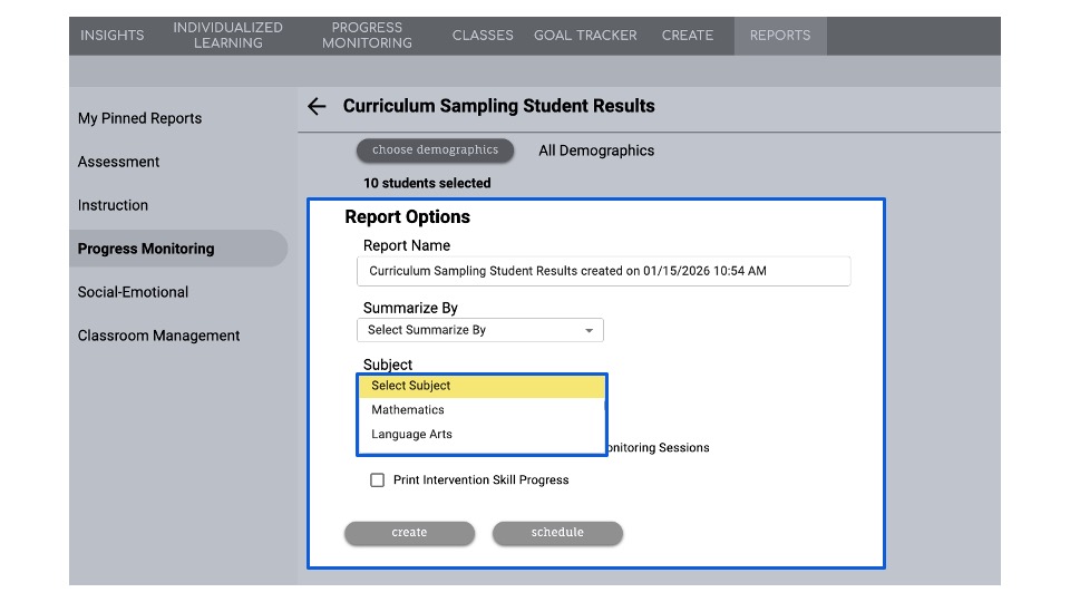 Scroll to Curriculum Sampling Student Results and click Create