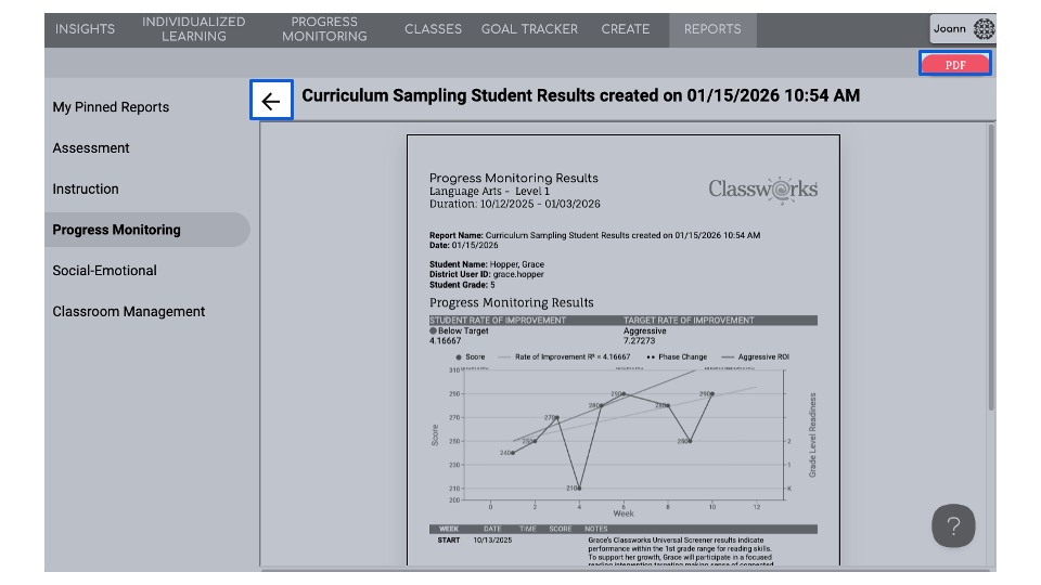 This is the report that educators use to maintain communication with caregivers about the progress their child is making. Student Support Teams (SST), MTSS teams, and Child Find teams also refer to the information in this report to guide adjustments to the student's intervention plan.