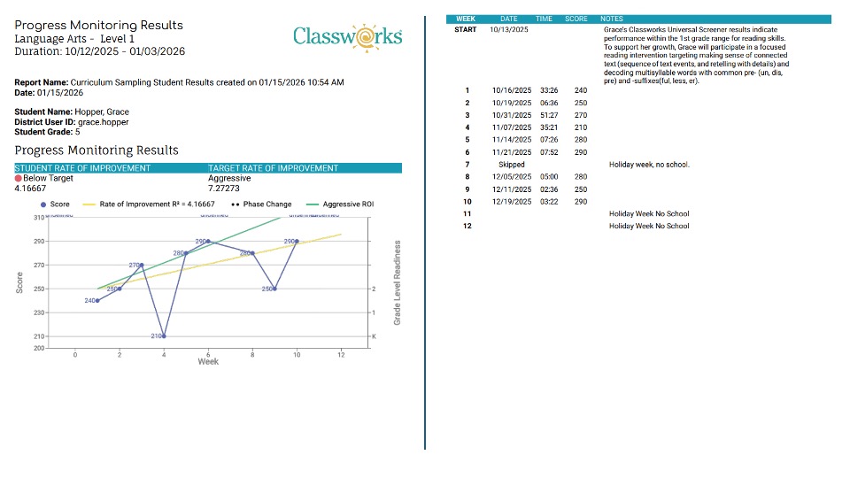 The Notes column includes teacher-authored comments to provide additional narrative. In the sample report below, the teacher used this comment feature to provide an explanation for the weeks where the probes were not completed.
