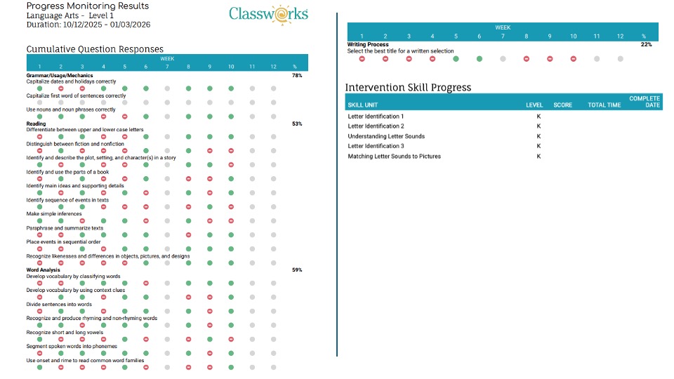 - Print Intervention Skill Progress: Will include a list of the ILP units and unit averages completed by the student. This is frequently used when teachers want to compare Progress Monitoring performance with correlated instructional performance.
