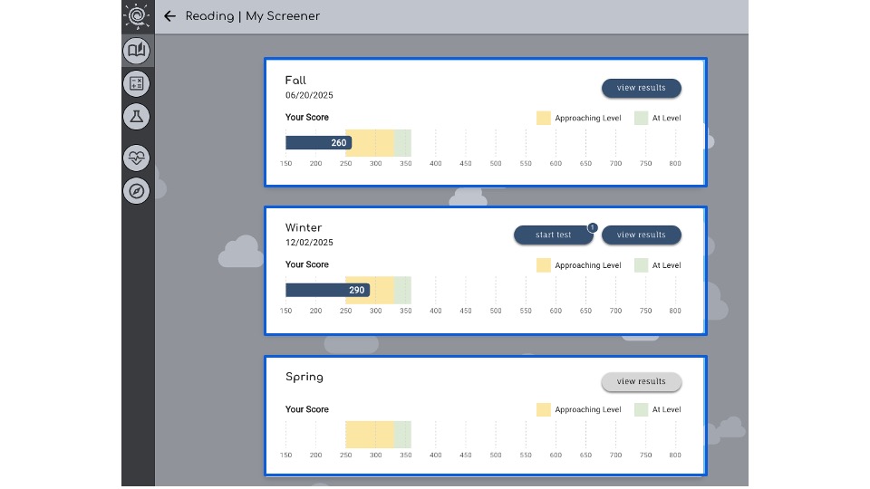 Students view their previous and current performance details and start a new screener attempt by clicking on a content area from their Classworks landing page.