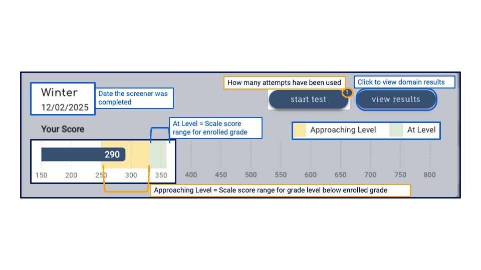 - Yellow Highlight: Approaching Level (yellow highlight) corresponds with the score range for one grade level below the student’s current assigned grade