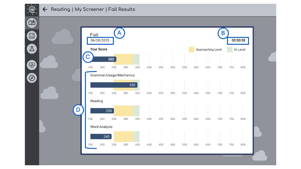- Green Highlight: At Level (green highlight) corresponds with the on-grade level score range for the student’s current assigned grade
