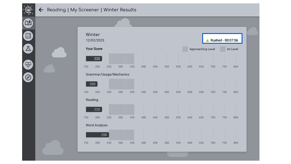 If "Rushed" appears, Classworks recommends that the student be guided to "retake" the screener and spend adequate time to complete it thoughtfully.