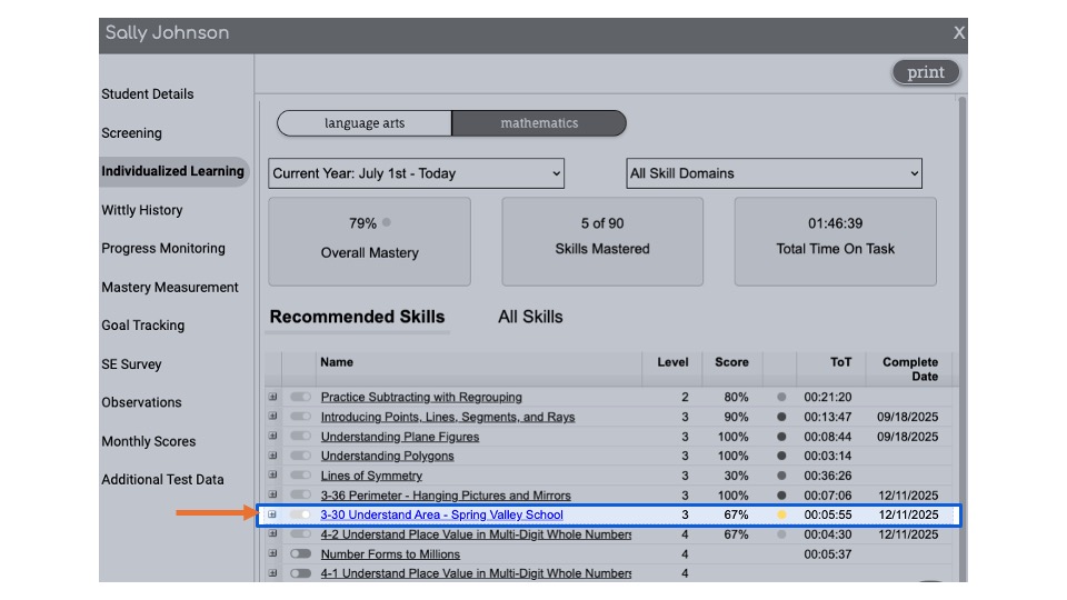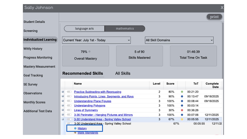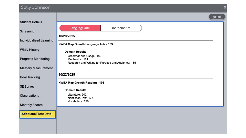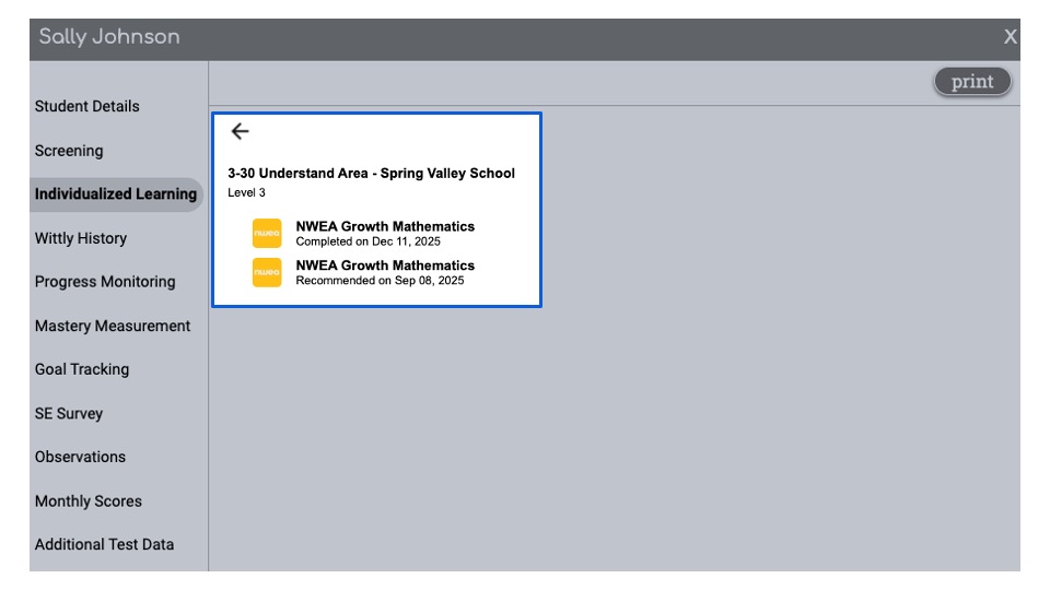 - Any NWEA Growth data that has been uploaded for that student will appear here.