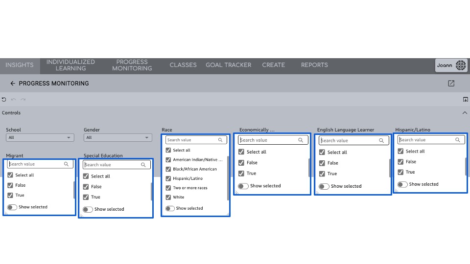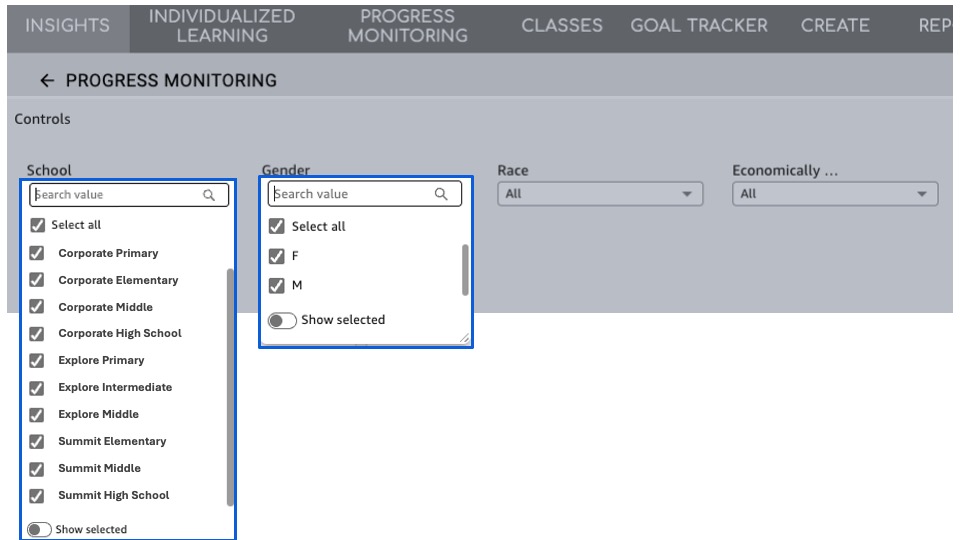 Select Schools: Filter to specific schools or view the district as a whole
