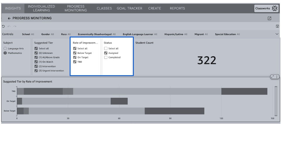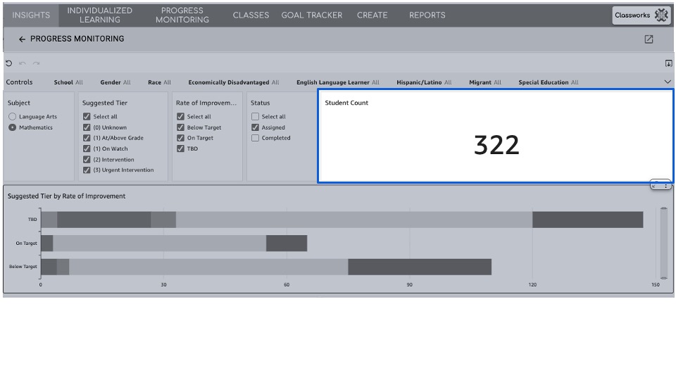 Gender: Filter to monitor or review gender subgroups (If demographic data has been shared with Classworks)