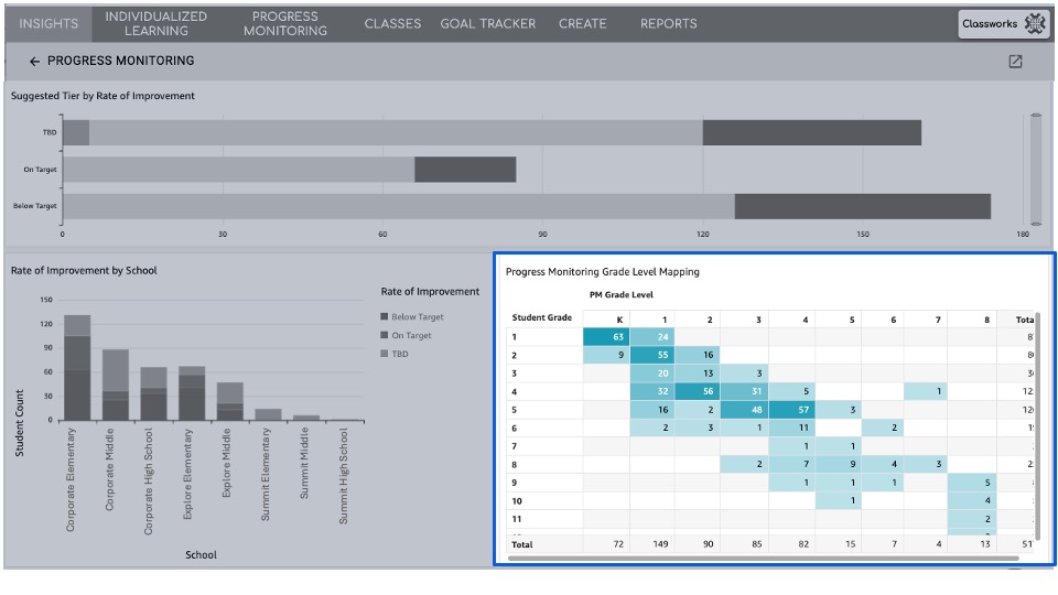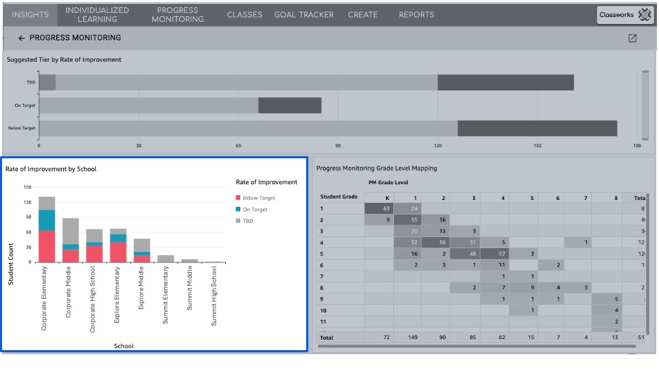 - Look at the 4th-grade row below. 1 student has been assigned Progress Monitoring at the 7th grade level. Clicking that specific cell in the table will update all of the data on the dashboard so you can view which school this student is enrolled at, and their rate of improvement.