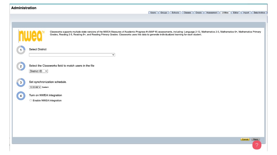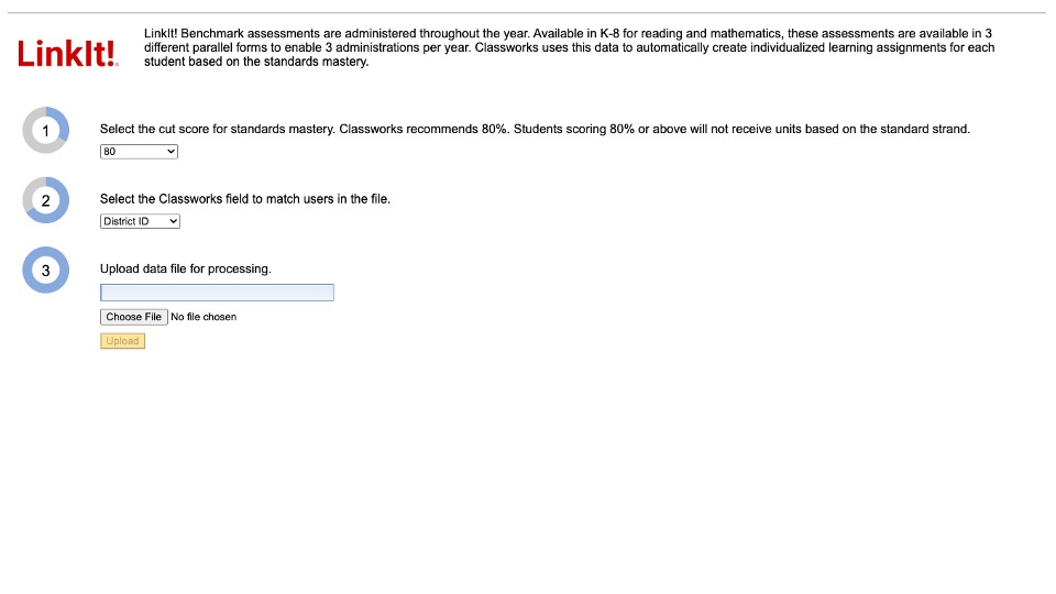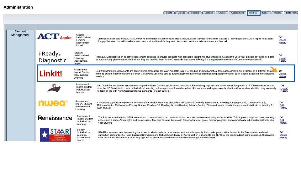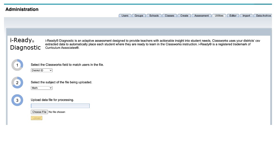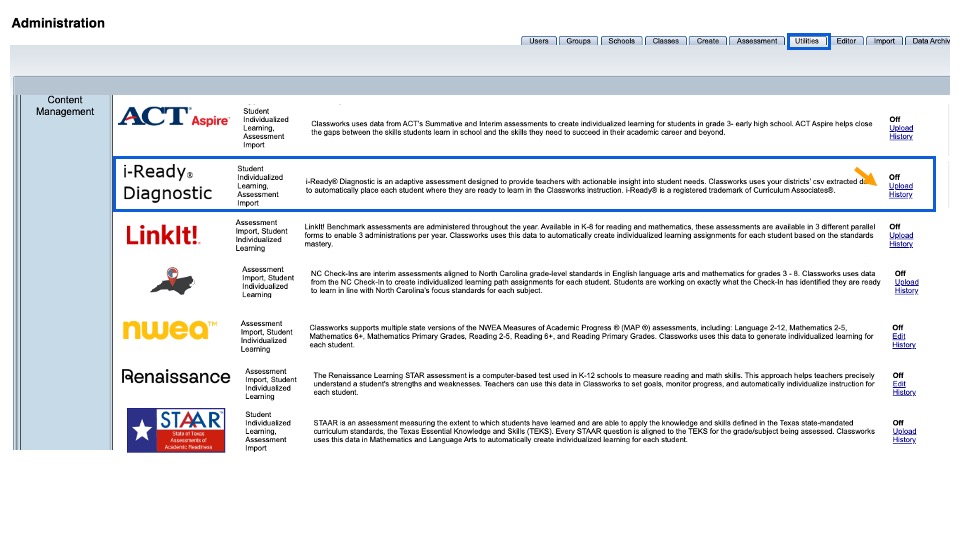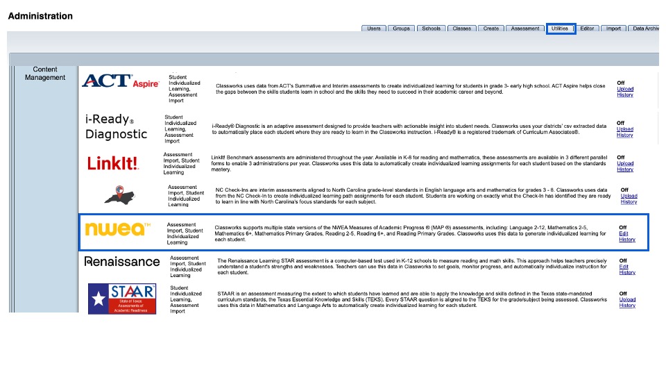 Classworks Assessment Integration allows district administrative users to set up third-party assessment results for use in Classworks. These assessment results can be used to create individualized learning for students.