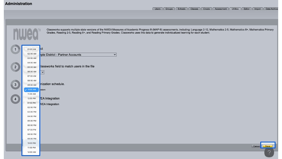 - From the drop-down box, select the time that Classworks will attempt to import data, daily.