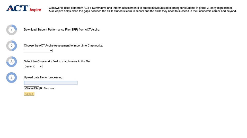 - Choose the ACT Aspire Assessment to import into Classworks - Interim or Summative.