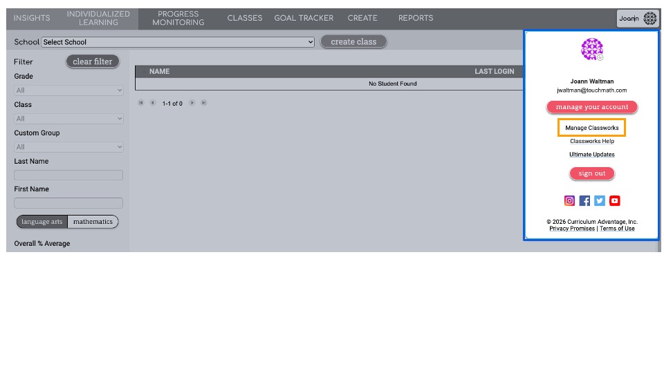 In the top right, click your name and select the Manage Classworks page.