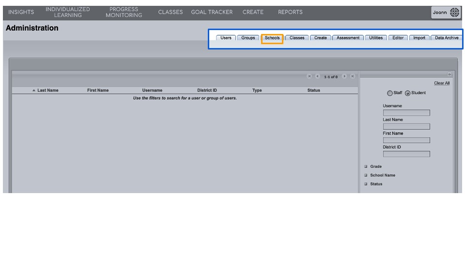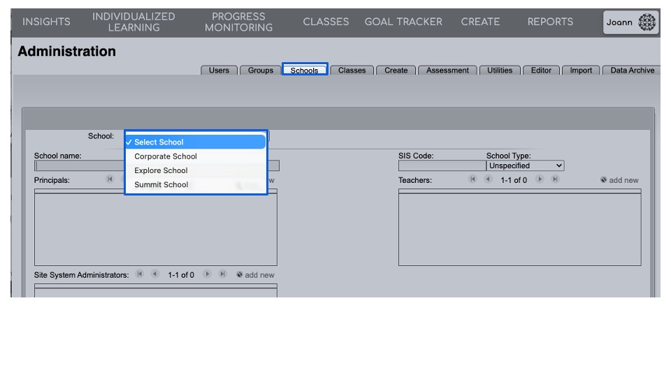 - Select Schools from the tabs at the top of the screen