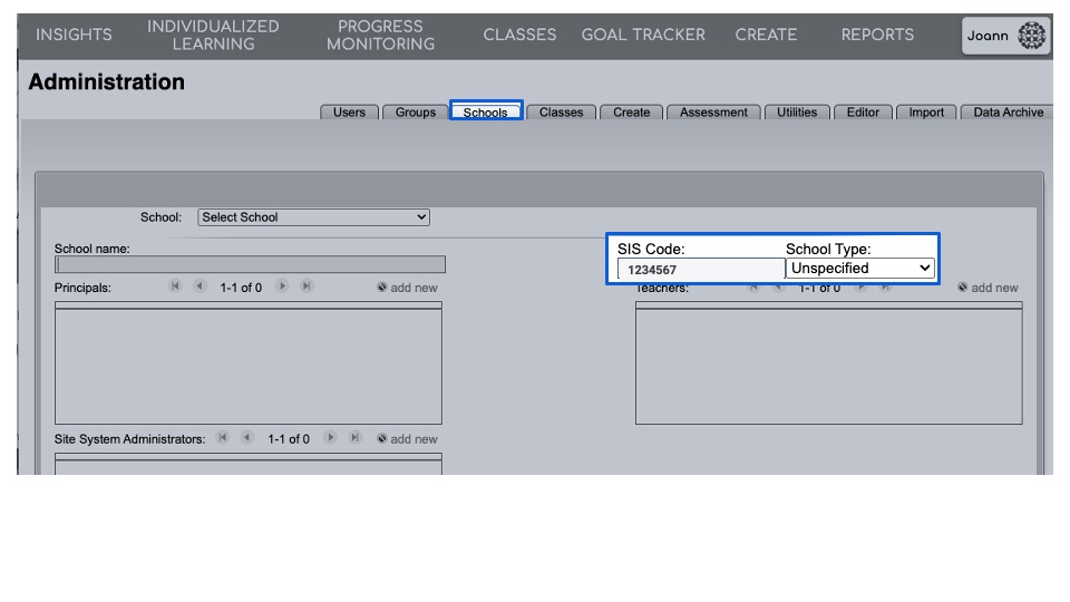 - Notice the School's SIS Code in the table along the right side of the screen. The information entered for each user must match this exactly; otherwise, users will only be added to the district, and not enrolled at a school within Classworks.