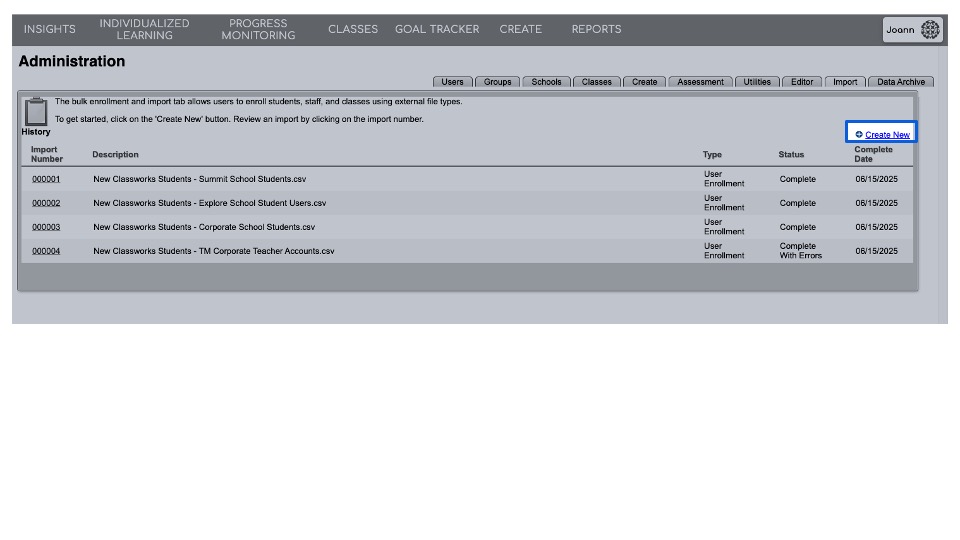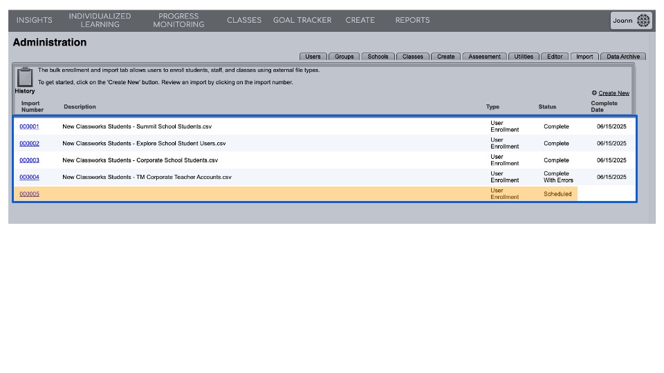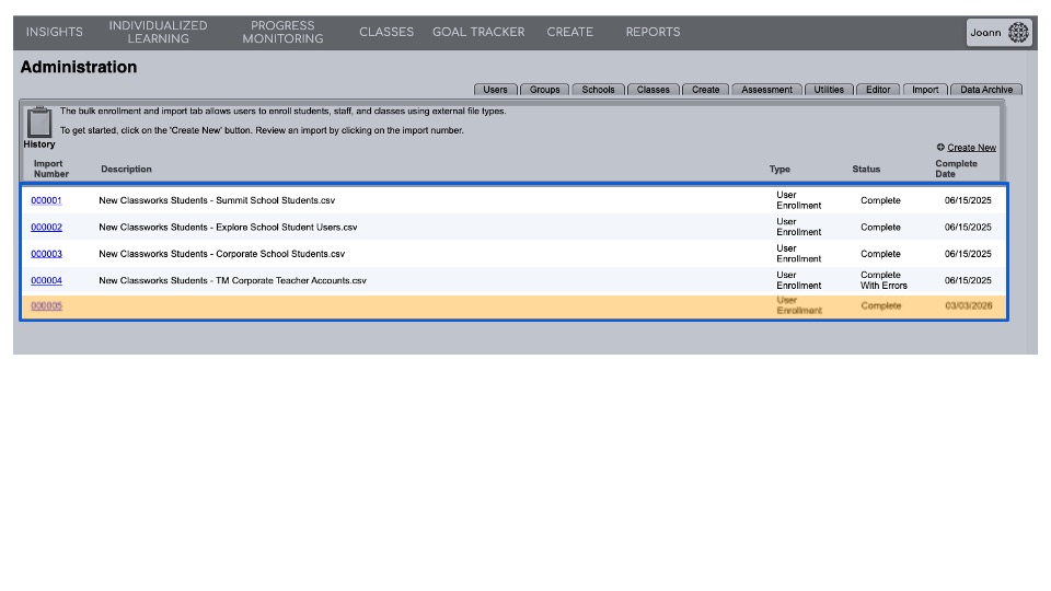After submitting the file, you can access the details of the import by navigating back to the Administration page > Import sub-tab.