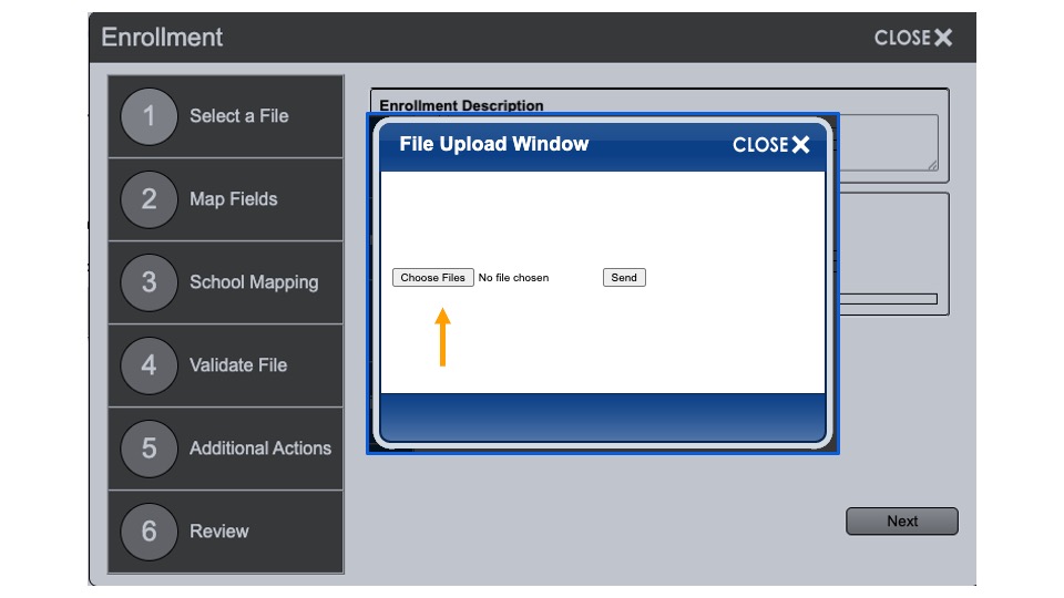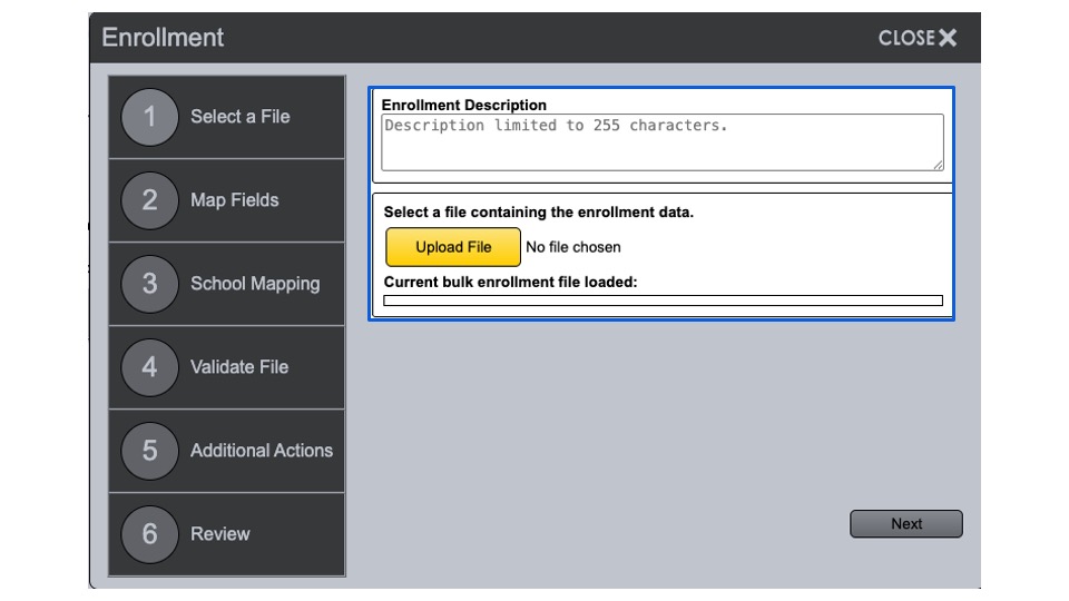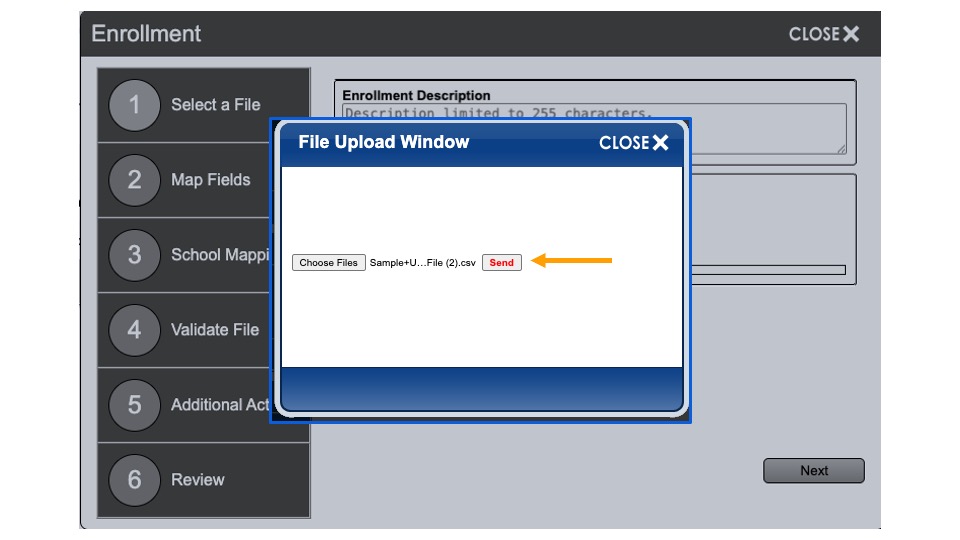 Select a File: Add a description for the enrollment information that will be uploaded. This is an optional step. (Example: First Street ES Student File)
