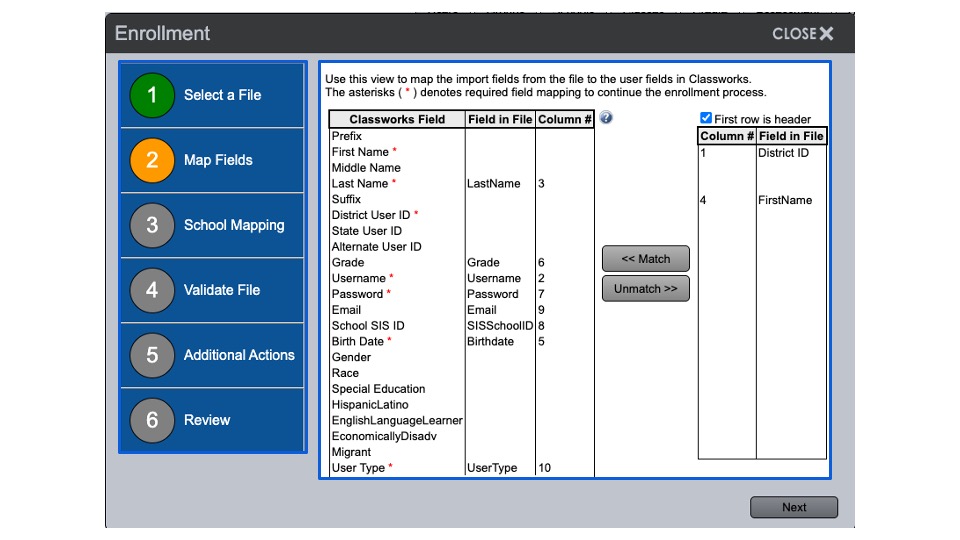 On this screen, match the import fields from the .csv file to the user fields in Classworks.