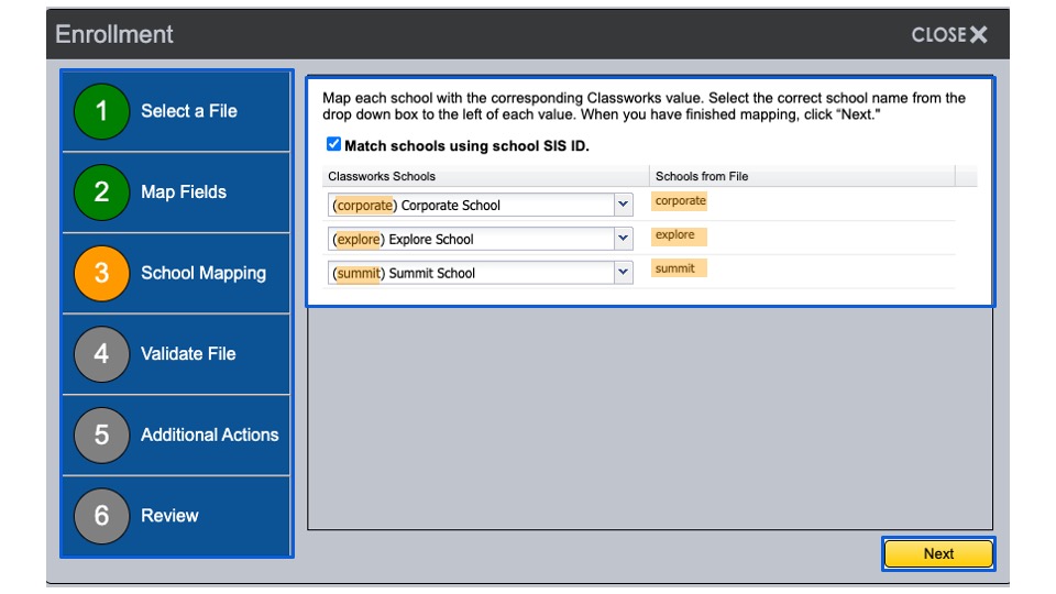 Map each school with the corresponding Classworks value. Select the correct school name from the drop-down box to the left of each value. When you have finished mapping, click Next.