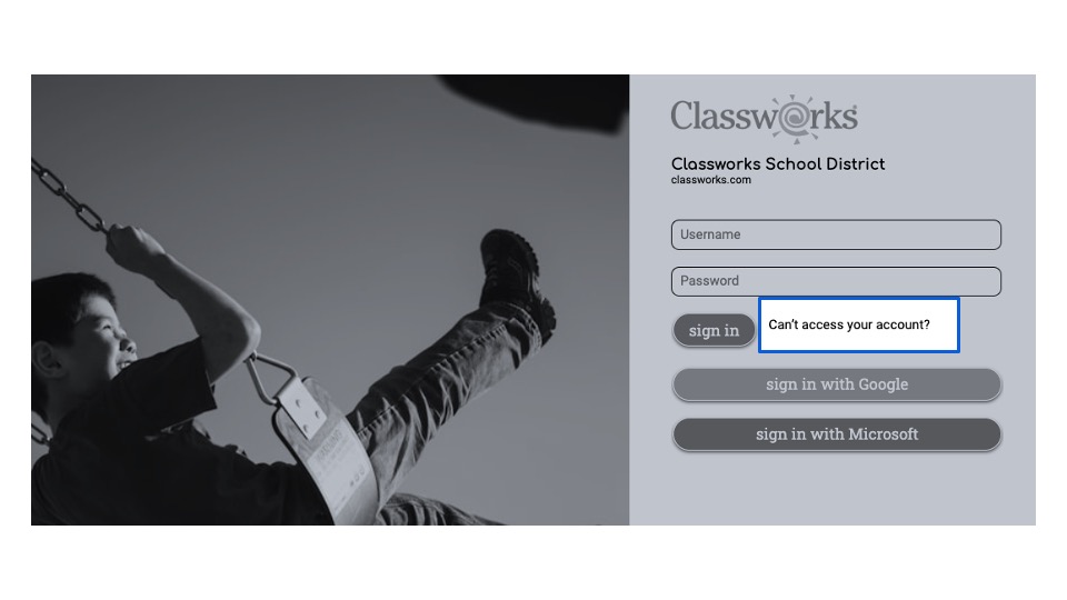 If you access Classworks through your school or organization’s login system, Single Sign-On is enabled. In this case, your System Administrator must assist with resetting your password. Single Sign-On access may include logging in through: