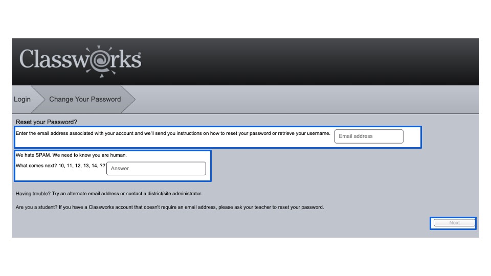 If an email address is associated with your Classworks login, you can reset your password from your district's unique Classworks URL. To reset your password, follow these steps:
