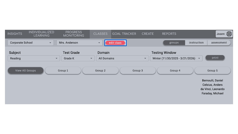 Navigate to the Edit Class Menu from the Progress Monitoring, Individualized Learning, or Classes screen