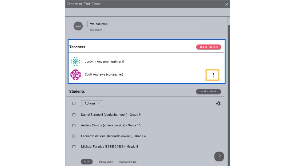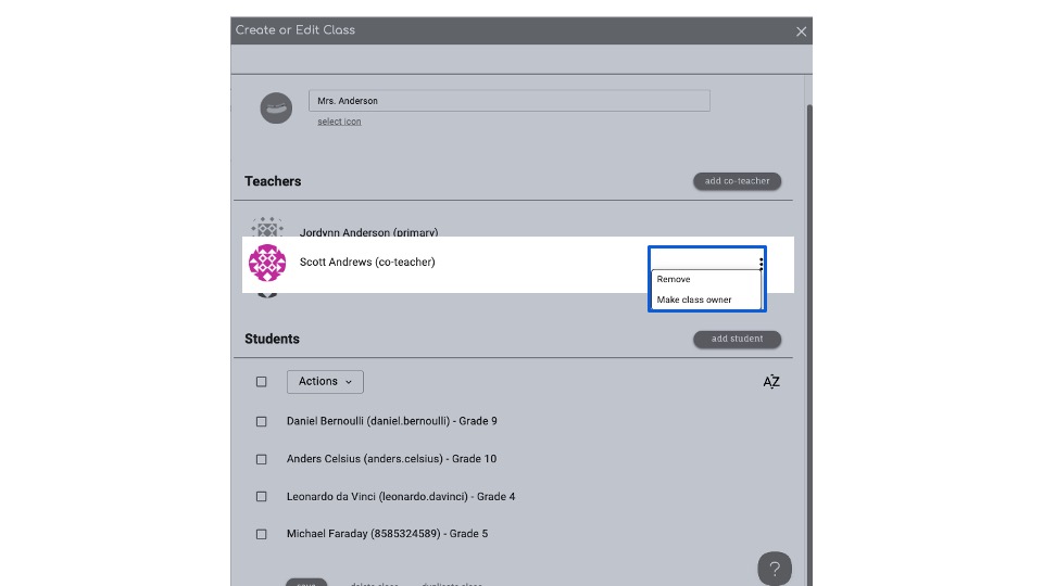 Note: To remove the Primary Teacher, you must first select a new Primary Teacher by either switching ownership of the class or adding a Co-Teacher