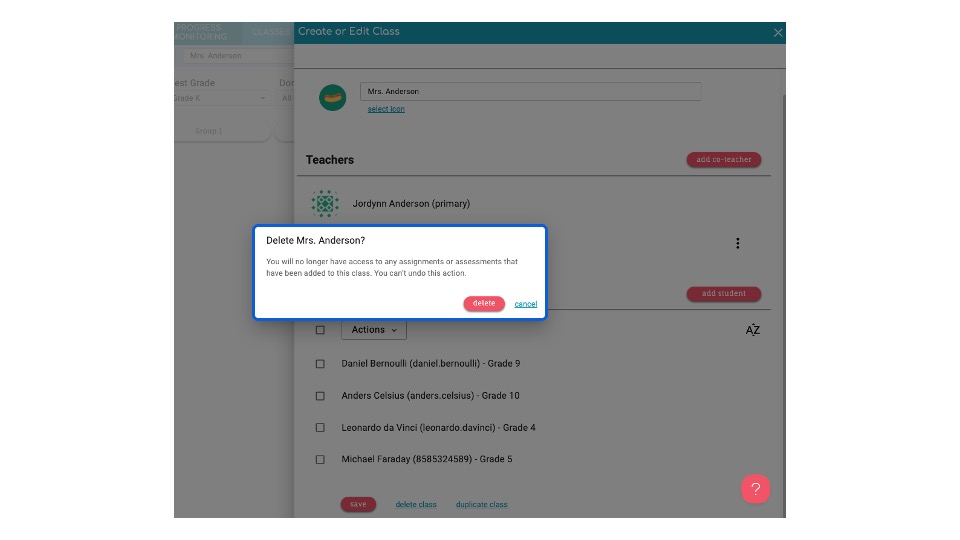 - Teachers can only delete classes they are assigned to as either the Primary Teacher or a Co-Teacher.