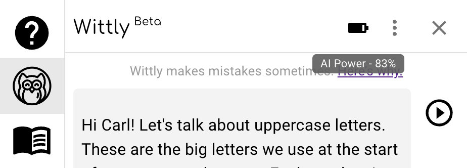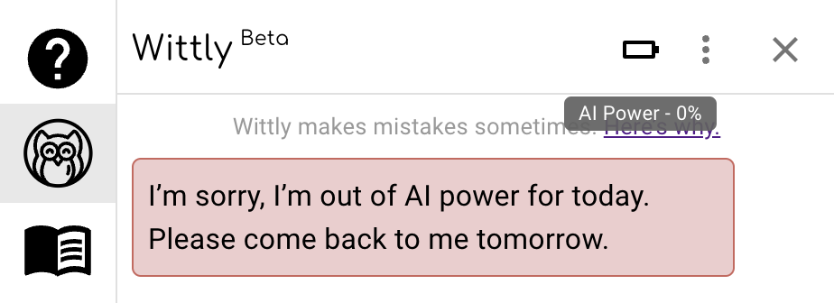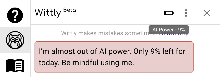 The student can easily keep track of Wittly's remaining AI power: