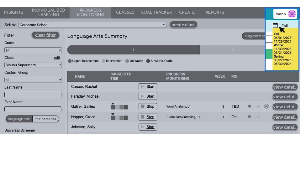The Universal Screener testing windows are set at the district level. By design, an assessment is available each day during the school year to make it easier to identify readiness or instructional levels for newly enrolled students.