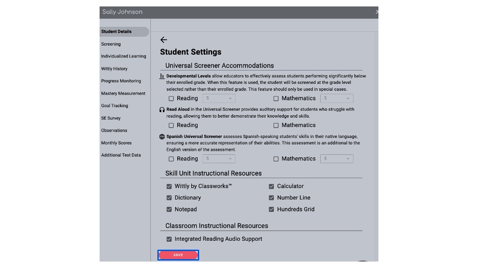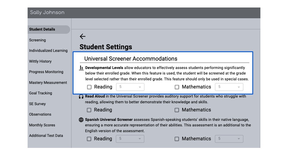 - If developmental level is used, the student's Universal Screener experience will be based on the grade level you select rather than the student's chronological grade, as is typically the case.