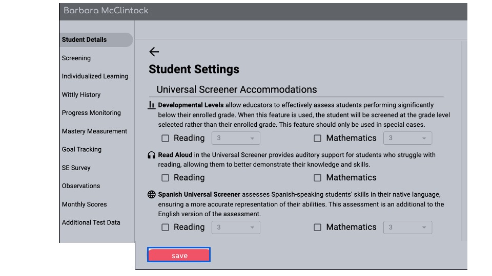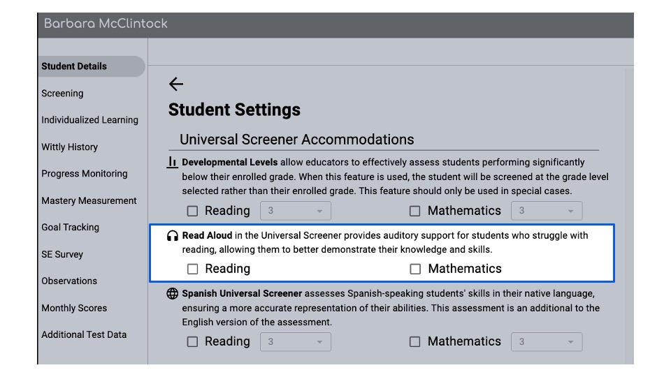 Locate the Universal Screener Accommodations Read Aloud section