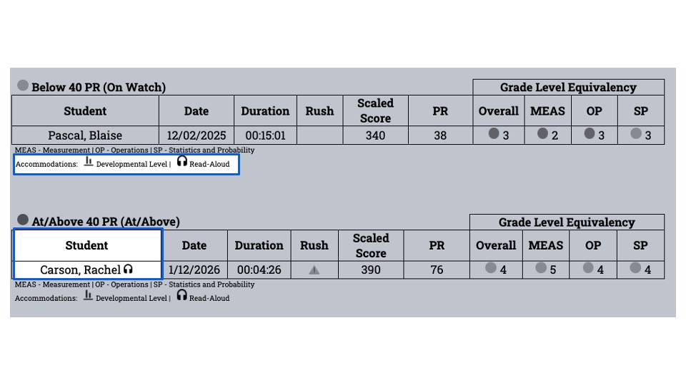 In the sample below - Rachel completed the screener using the Oral Administration accommodation