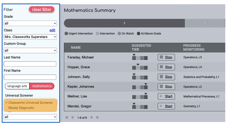 Many districts set routines based on which tier of support a student would benefit from. Most of the time, this determination is made using multiple data points. Classworks Universal Screeners and Partner Assessments (iReady, NWEA Map, Renaissance Star), and performance on classroom measures and high-stakes tests can be considered.