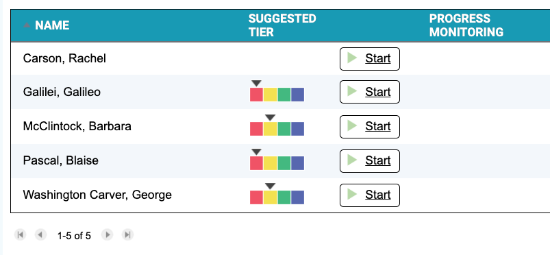 To view your student's suggested tier level for the current testing window (Fall, Winter, or Spring), navigate to the Progress Monitoring page and use the filters to find the student(s) you would like to view.