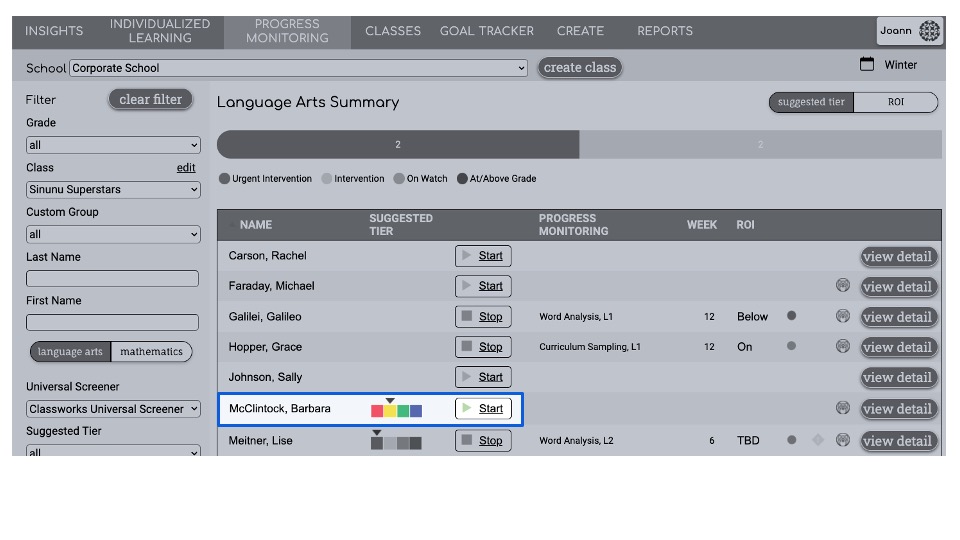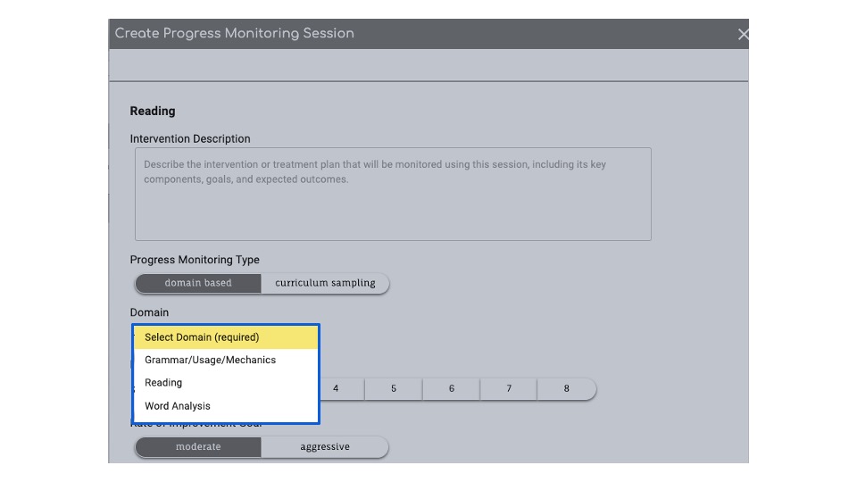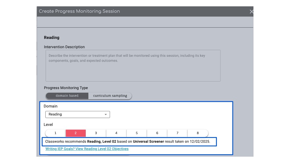 Classworks automatically references the Universal Screener performance to recommend the level of Progress Monitoring in that domain