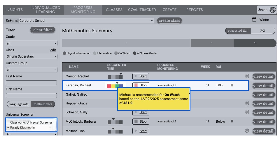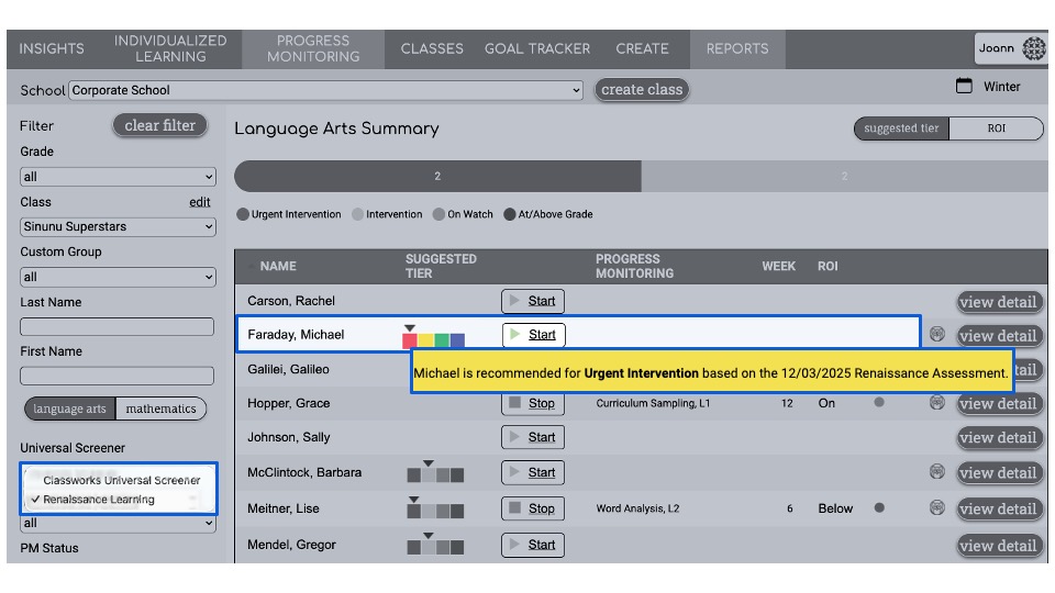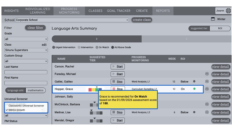 Refer to the reporting from your testing platforms to identify the level of progress monitoring appropriate for each student