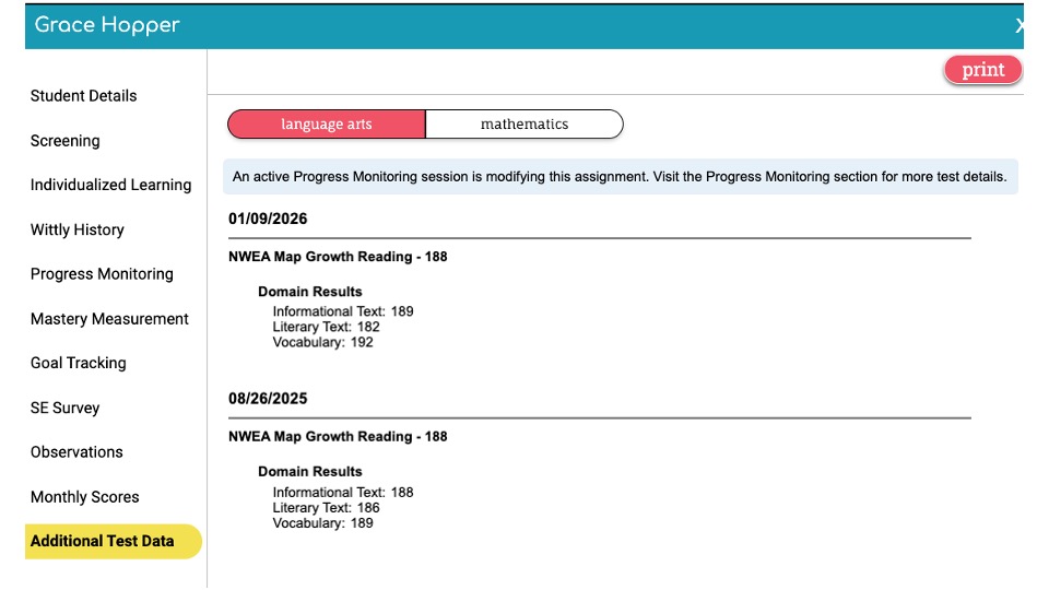 - Select Additional Test Data to view the date the student completed the MAP, their overall and domain-specific results