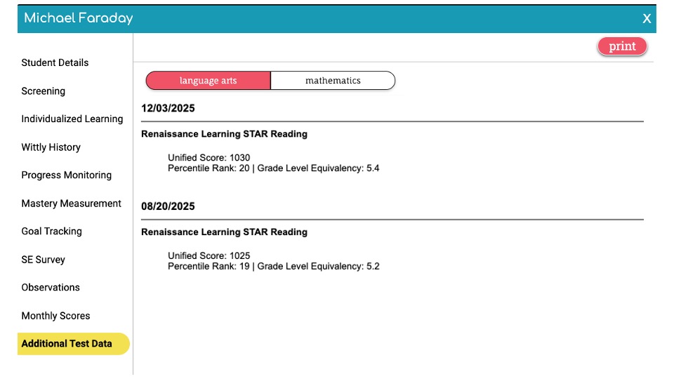 - Select Additional Test Data to view the date the student completed the Star, their unified score, percentile rank, and grade level equivalency.